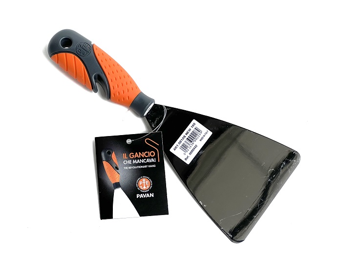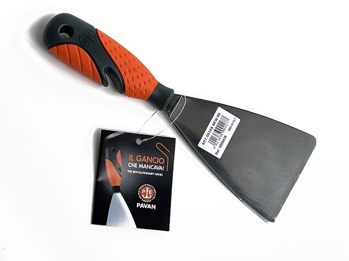 Допоміжний шпатель з дзеркально полірованої нержавіючої сталі з гумовою ручкою; закруглені кути; дуже високоякісна скругленная кромка леза; для роботи з венеціанською штукатуркою та іншими декоративними.